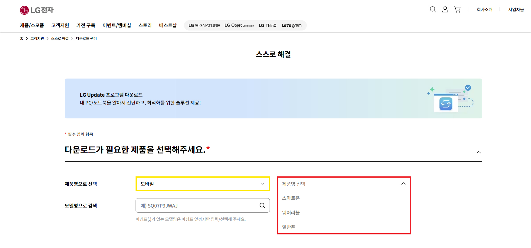 (진입 경로: LG전자 홈> 고객지원> 스스로 해결> 다운로드 센터)