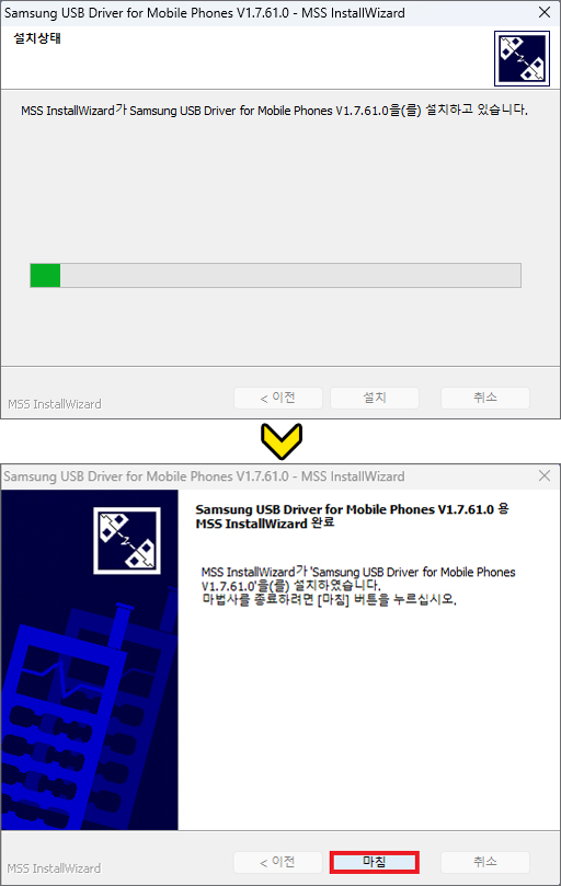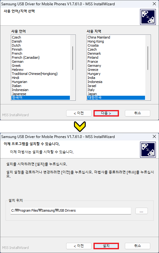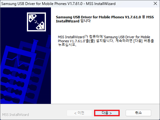 잠시 후 Samsung USB Driver for Mobile Phones V1.7.61.0 - MSS InstallWizard 창이 뜰 것이므로 계속 진행하기 위해 [다음]을 누릅니다.