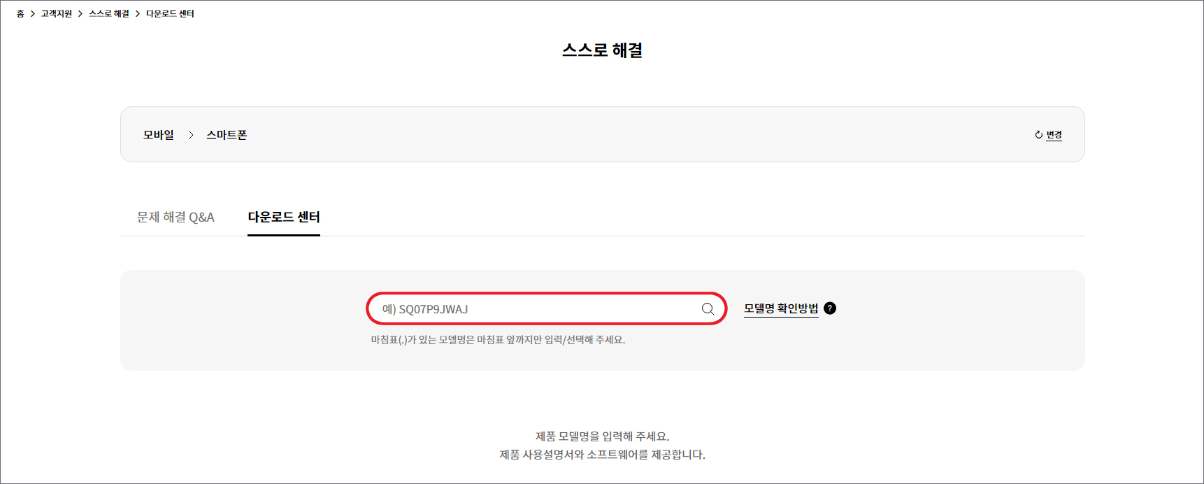 다운로드가 필요한 제품을 선택하라고 나와있으니 제품명으로 선택 옆에 제품군 선택 목록을 누르고 '모바일'을 클릭한 다음 우측에 스마트폰, 웨어러블, 일반폰 중에 해당되는 걸 클릭하세요.