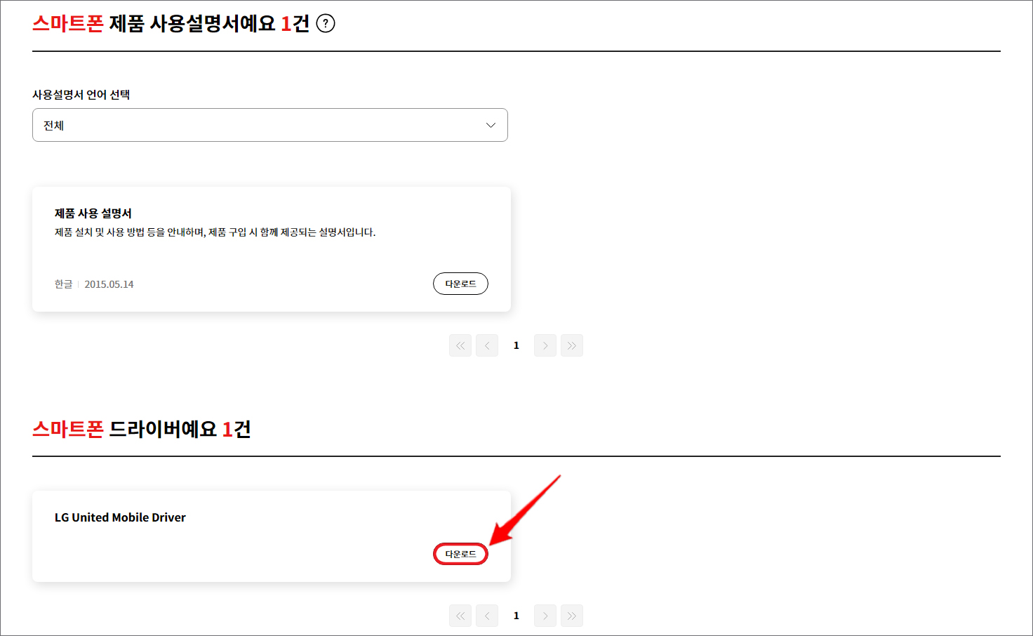 검색 결과로 제품 사용 설명서가 맨 위에 나오고 아래쪽을 보면 LG United Mobile Driver 항목을 확인하실 수 있으니 [다운로드] 버튼을 누릅니다.