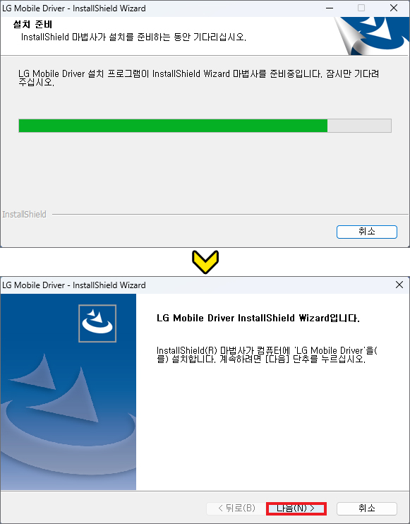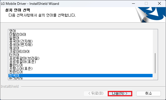 사용자 계정 컨트롤 창이 뜨면서 이 앱이 디바이스를 변경할 수 있도록 허용하겠냐고 물을 테니 [예]를 누르고 이어서 LG Mobile Driver - InstallShield Wizard 창이 나오는데 설치 언어로 [한국어]가 선택된 상태에서 [다음]을 누릅니다.