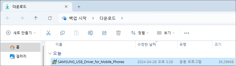 잠시만 기다렸다가 지정된 다운로드 경로를 찾아 들어가 보면 SAMSUNG_USB_Driver_for_Mobile_Phones라는 이름의 파일이 생성되어 있을 테니 더블클릭해서 실행합니다.
